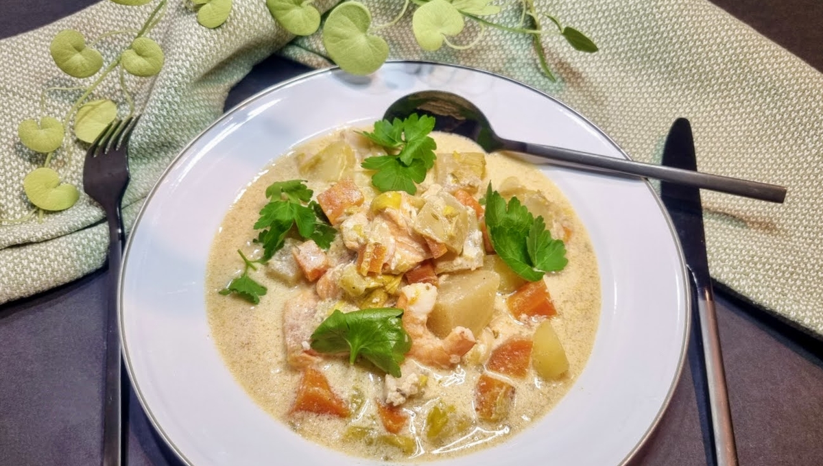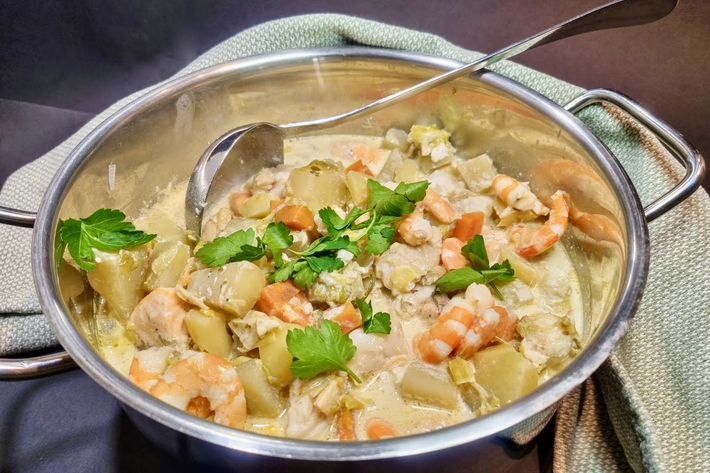 Entre chaudrée et waterzooï, en l’honneur de la saint Patrick, je me suis amusée à improviser un genre de seafood chowder (pas forcément vraiment authentique), avec les légumes qui me tentaient. Le gros avantage, c’est que c’est une soupe qui fait tout le repas : soupe, poisson et légumes. Pas mal, non ? C’est ma petite contribution au défi cuisine de la saint Patrick pour le site Recettes de cuisine.