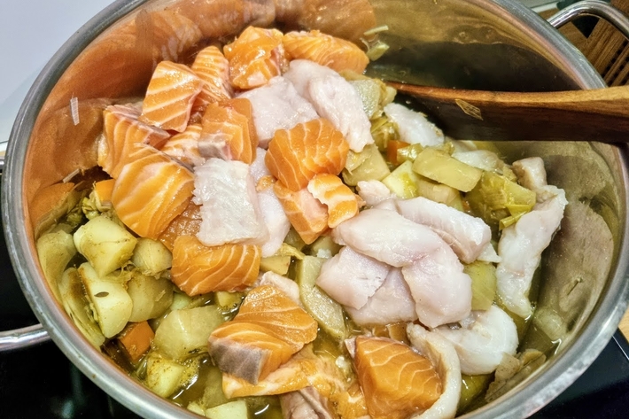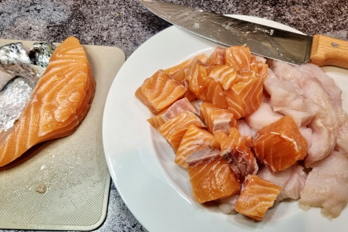Retirez la peau du saumon et coupez les poissons (pour le poisson blanc, j’ai pris du loup) en gros tronçons.