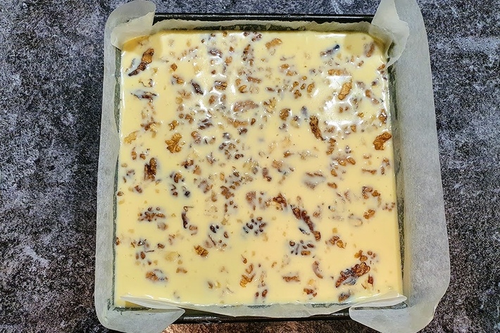 Beurrez le plat (j’ai chemisé le plat de papier cuisson pour le démouler en beauté par la suite) et versez-y la préparation.