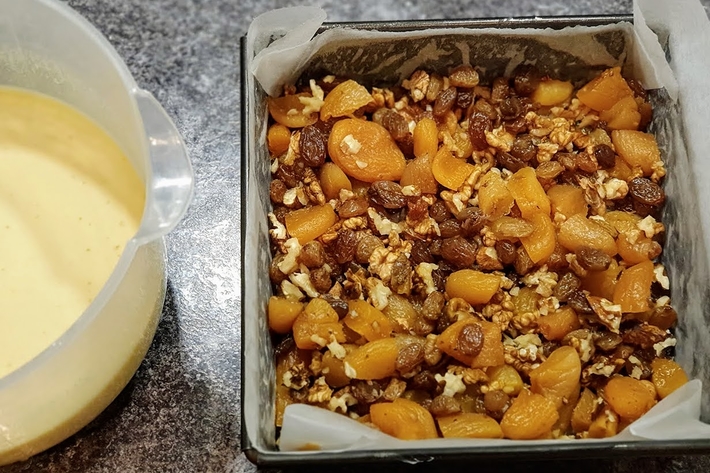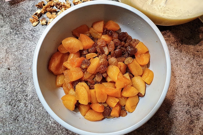 La veille, coupez les abricots en morceaux, mélangez-les avec les raisins secs et le cognac. Remuez-les de temps en temps.