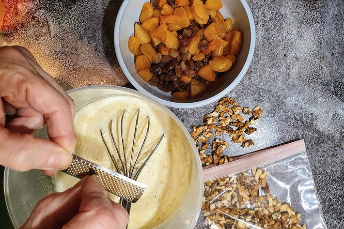 Incorporez les fruits secs et le cognac restant en continuant à battre.