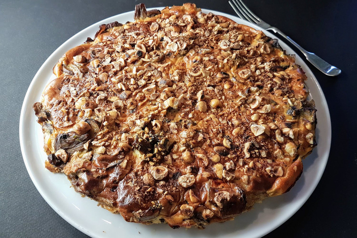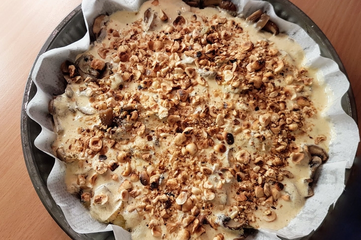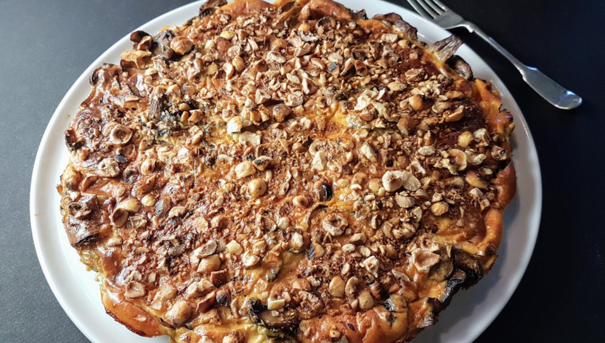 Petite improvisation autour d’une envie de quiche, mais sans pâte, et garnie de légumes d’automne : des champignons de Paris pour faire simple, mais des pleurotes auraient été parfaits, ou –plus recherchées– des trompettes de mort. Et je m’efforce de toujours avoir un peu de noisettes grillées sous la main.