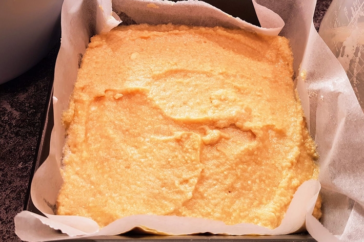 Tapissez un moule carré (18 cm) de papier sulfurisé, versez la pâte et enfournez pour 35 minutes, jusqu’à ce que le gâteau soit bien doré. En piquant une pointe de couteau, elle doit ressortir propre.