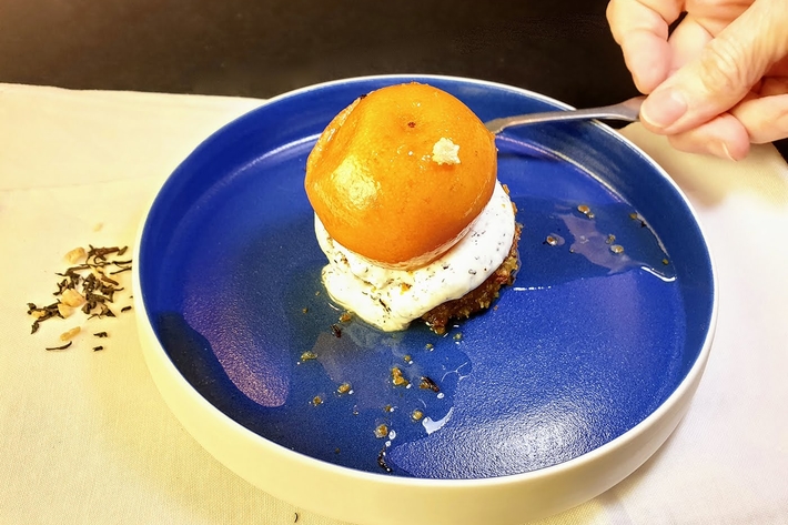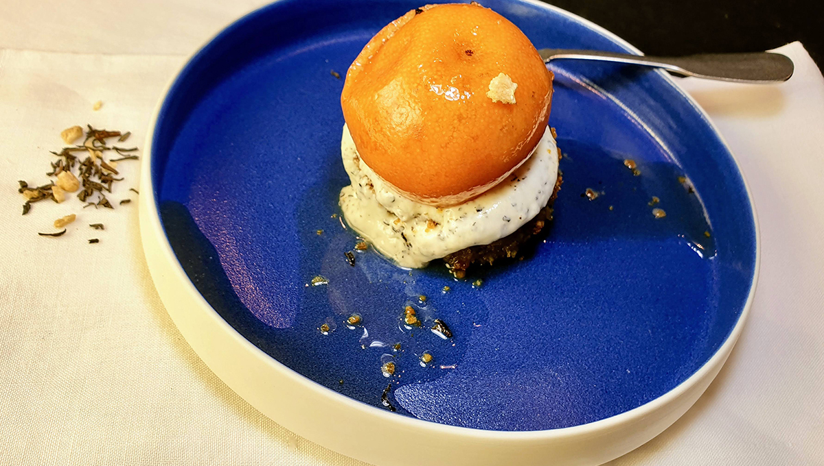 Déposez un peu de crème fouettée au thé par-dessus et surmontez d’une clémentine confite.