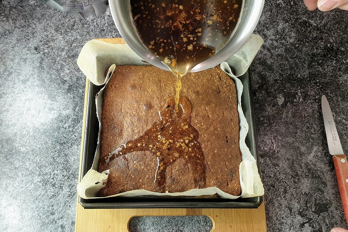 Répartissez la basboussa dans des assiettes creuses et imbibez-la d’encore un peu de sirop.