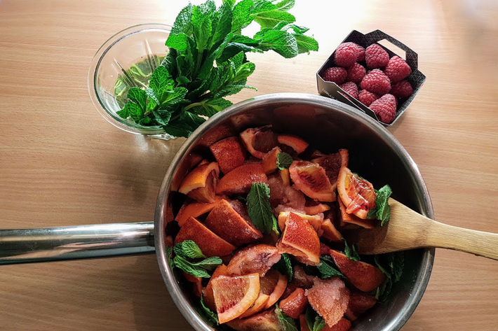 Mêlez les oranges au sucre et aux feuilles de menthe (gardez-en quelques unes pour les finitions) dans une casserole ou un faitout à fond épais – idéalement une bassine à confiture en cuivre.
