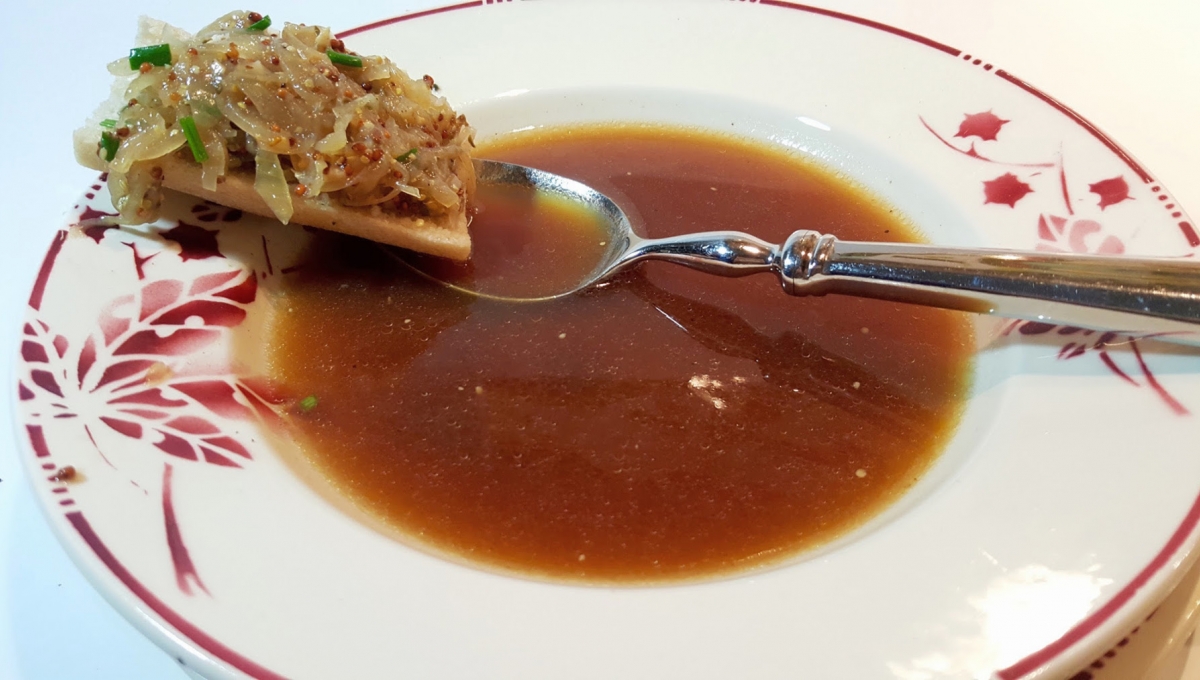 Refaites chauffer le bouillon et ajoutez-y les rondelles d’oignon grillé et laissez infuser environ une demi-heure.