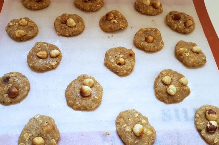 Parsemez les cookies avec le reste des noisettes et glissez au four pendant 10 minutes à 180° (thermostat 6) jusqu’à ce qu’ils soient dorés.