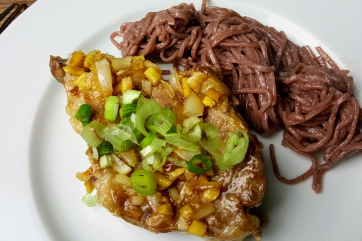 “Pendant la cuisson de la viande, faites cuire des pâtes de riz asiatiques et servez-les pour accompagner ce porc au gingembre et miel. Ces pâtes thaï, au jasmin rouge, demandent à tremper 10 minutes dans l’eau froide avant d’être mises à cuire, mais aucun temps de cuisson n’est indiqué : goûtez. En gros, pas plus de 5-7 minutes. Arrosez-les d’un peu de sauce soja.”