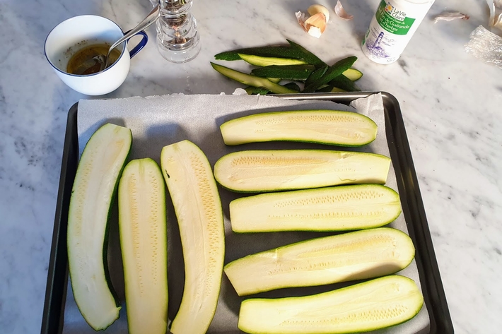 Placez les courgettes sous le gril pendant une bonne vingtaine de minutes, jusqu’à ce qu’elles soient bien grillées (brun foncé) et tendres.