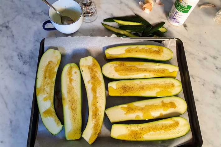 Mélangez l’huile d’olive avec un tiers de cuillerée à café de sel, une grosse mouture de poivre et badigeonnez-en le dessus des demi-courgettes.