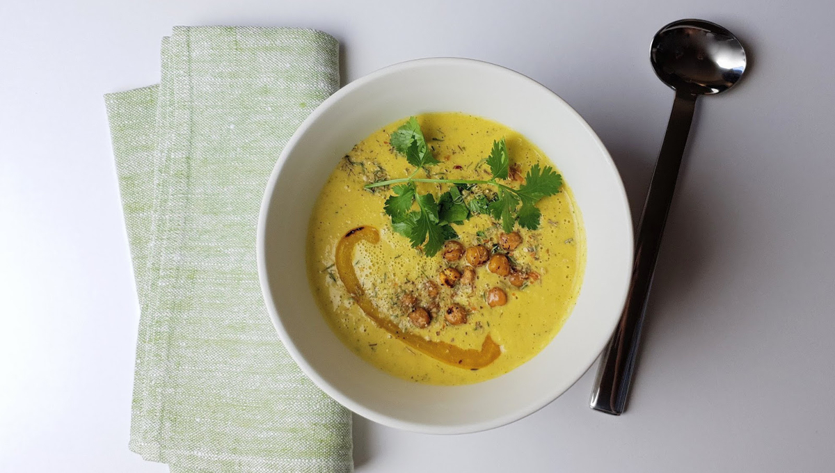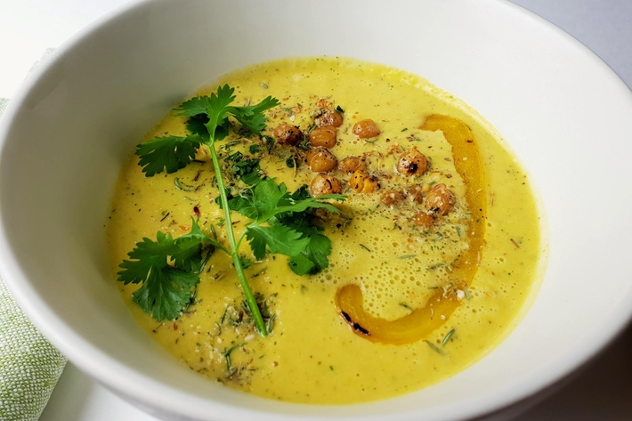 Répartissez cette crème veloutée dans 4 bols avec les pois chiches revenus et les lanières de poivron.