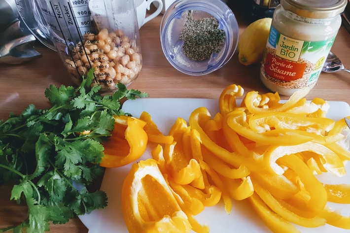 Mixez ensemble 200 grammes de pois chiches avec les poivrons sautés (gardez 4 lanières fines de poivrons pour le décor), l’ail, le jus de citron, la pâte de sésame, un peu de sel et de poivre.