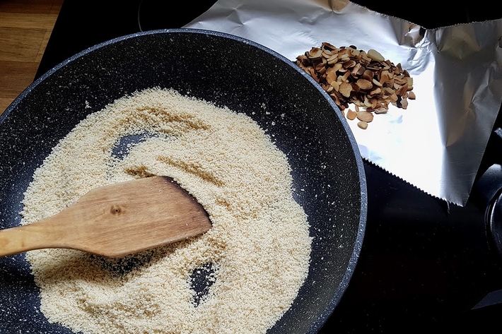 Faites torréfier rapidement (sans colorer) la poudre d’amande dans une poêle antiadhésive.