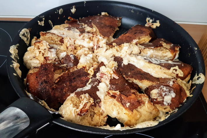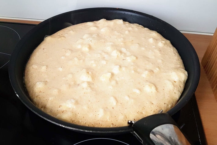 Dès que la masse est prise, divisez-la à l’aide d’une spatule et faites frire les morceaux de tous les côtés.