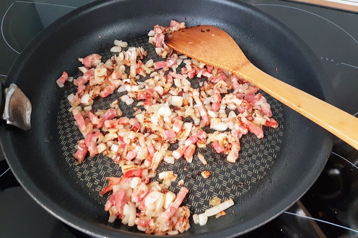 Faites suer les lardons dans une grande poêle et, après environ 2 minutes, ajoutez les rondelles d’oignons.