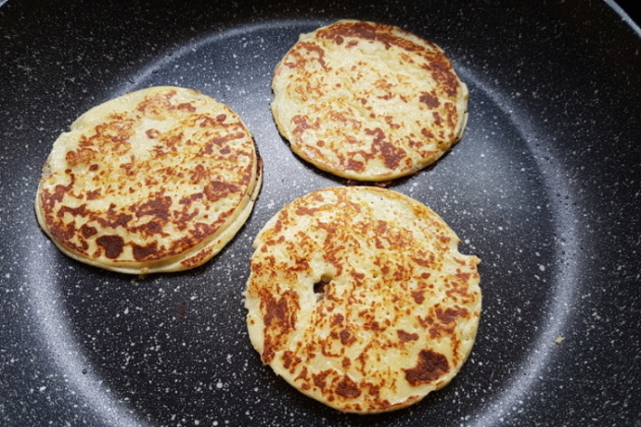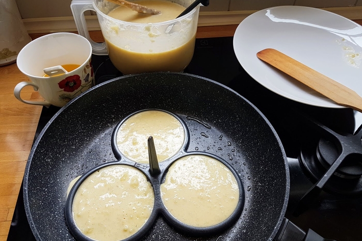 Quand les crêpes sont bien prises (comptez 2 minutes), retirez les formes, laissez encore un peu cuire, et retournez-les à l’aide d’une spatule souple.