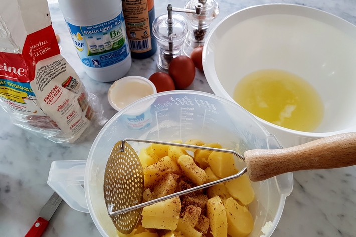 Épluchez-les et, dans un grand saladier, écrasez-les au presse-purée ou à la fourchette (pas au mixer) en ajoutant progressivement le lait et la crème.