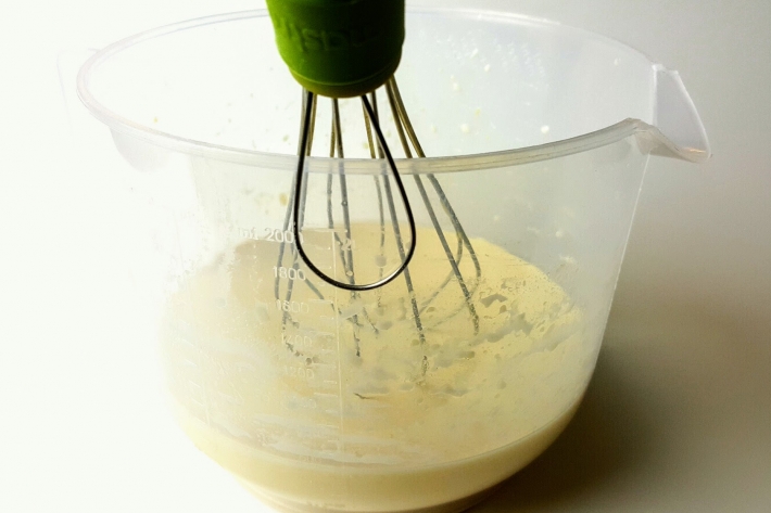 Versez aussi le lait en fouettant de façon à éviter les grumeaux (n’hésitez pas à utiliser un mixer plongeur).