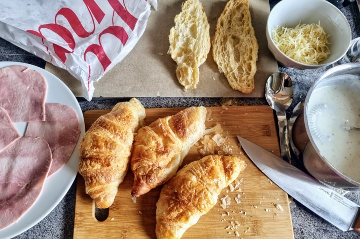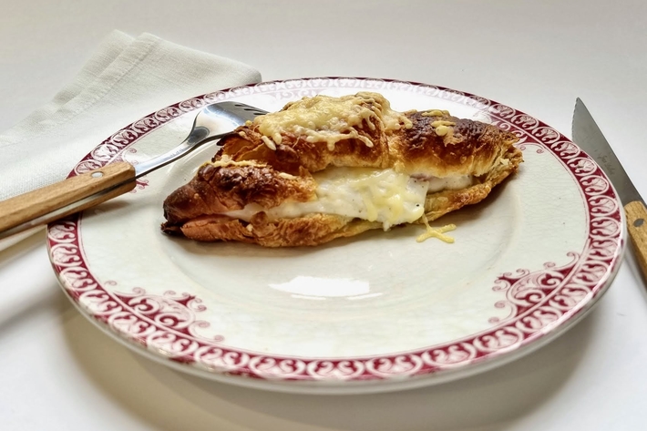 Parmi les petites préparations délicieusement régressives, le croissant au jambon fait un retour en force à notre plus grande joie. Seule la béchamel est à cuisiner, et encore ! Mieux vaut utiliser des croissants de la veille pour qu’ils ne soient pas trop mou à la découpe. Mais offrez-vous en des bons de chez votre boulanger préféré.