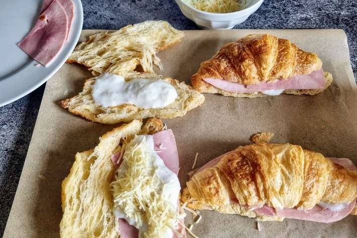 Répartissez la moitié de béchamel sur les moitiés de croissants.
