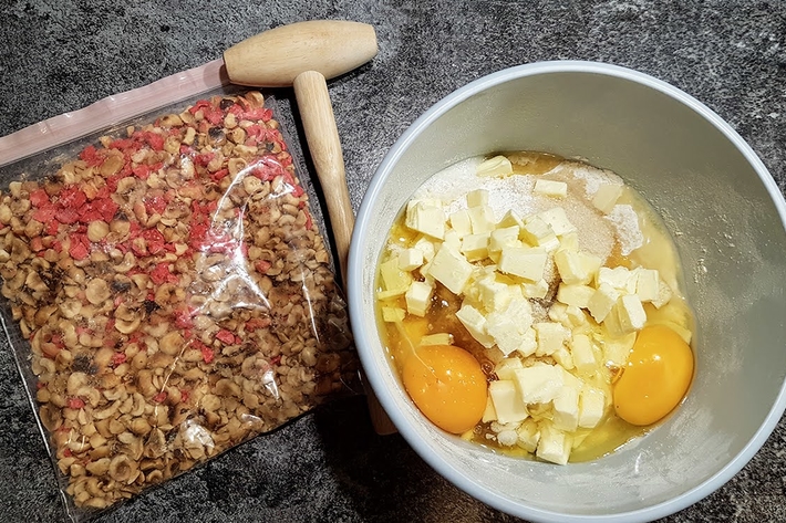 Concassez grossièrement les noisettes et les pralines, dans un sachet, avec un maillet ou un rouleau à pâtisserie.