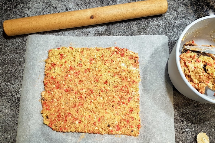 Étalez la pâte, sur une plaque beurrée ou une feuille de silicone, en rectangle d’1,5 centimètre d’épaisseur.