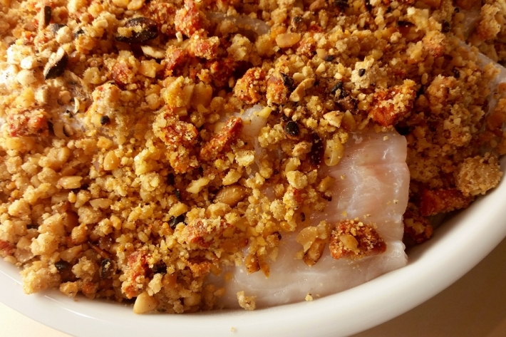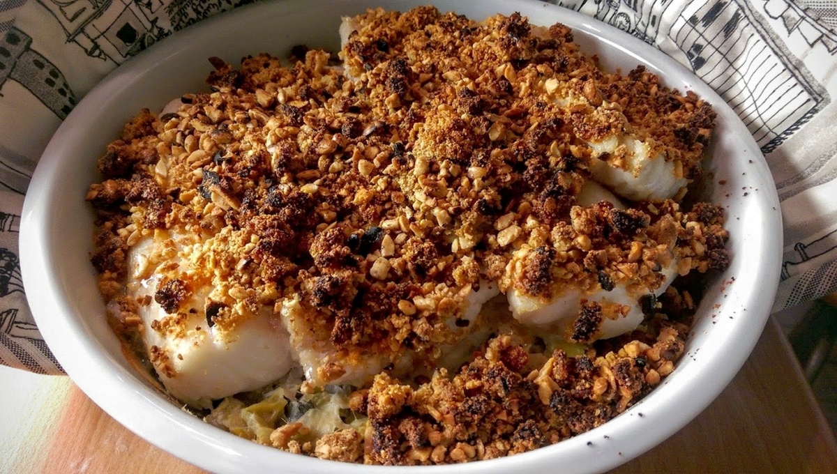 Dans un plat allant au four huilé, étalez la fondue de poireaux, déposez les pavés de poisson et recouvrez du “crumble” de chorizo-cacahètes.