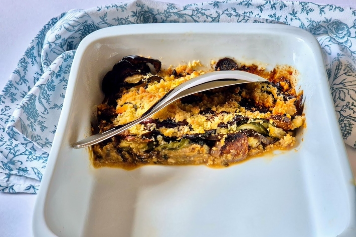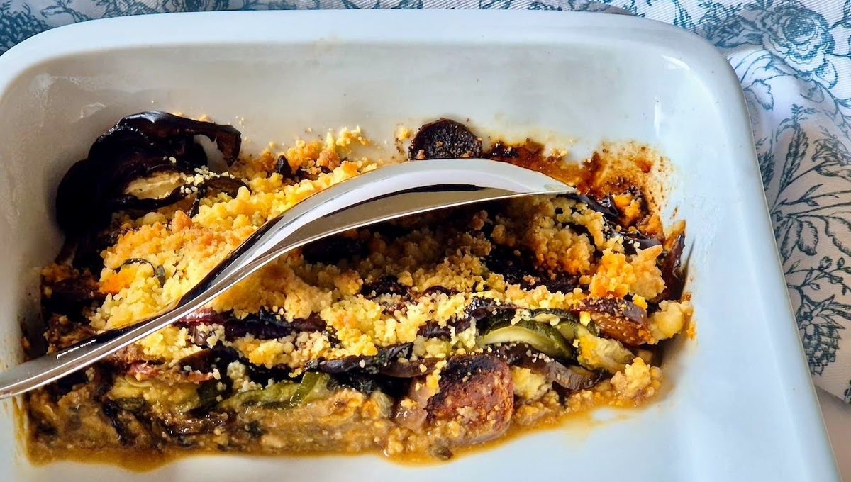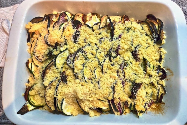 J’avais envie d’une pâte avec mes légumes d’été rôtis, mais pas d’une tarte. Alors, je les ai tout bonnement saupoudrés d’un crumble. C’est bête comme chou et cela donne une touche un poil plus soignée à ces simples légumes rôtis.