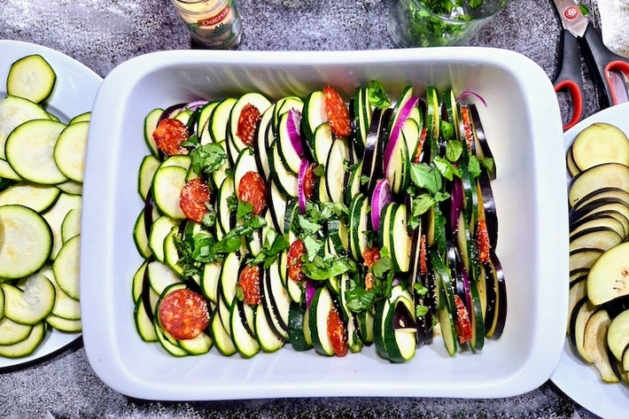 Huilez le fond d’un plat à four (c’est le plat que l’on nomme tian en occitan) et disposez verticalement les rondelles de légumes, bien serrées et alternées, comme un “tian”.
