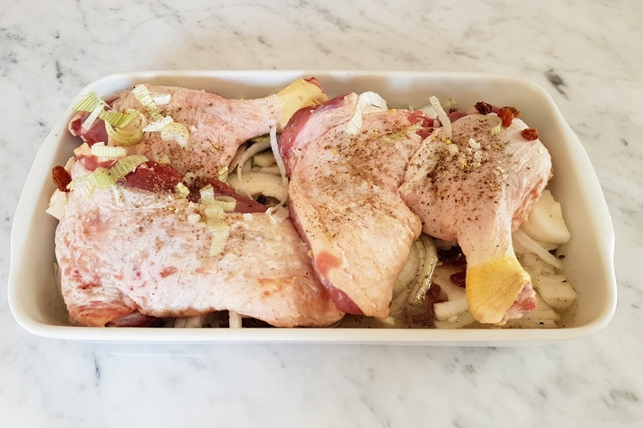Salez et poivrez les cuisses de canard côté chair avant de déposer ce côté sur les oignons, côté peau en l’air.