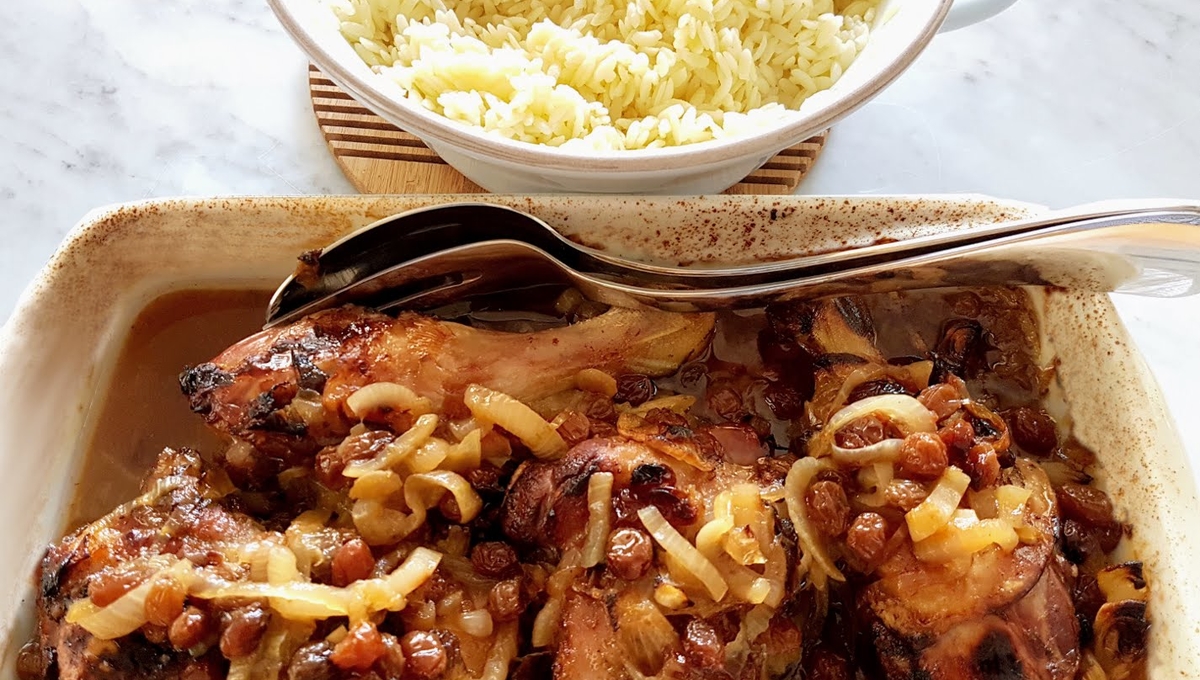 Répandez-en les rondelles avec les raisins secs (ils gonfleront à la cuisson), dans un plat à four.