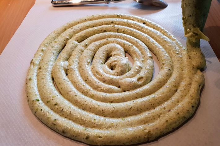Placez l’appareil à dacquoise dans une poche munie d’une douille ronde et remplissez les deux disques dessinés sur le papier sulfurisé en dessinant un escargot.