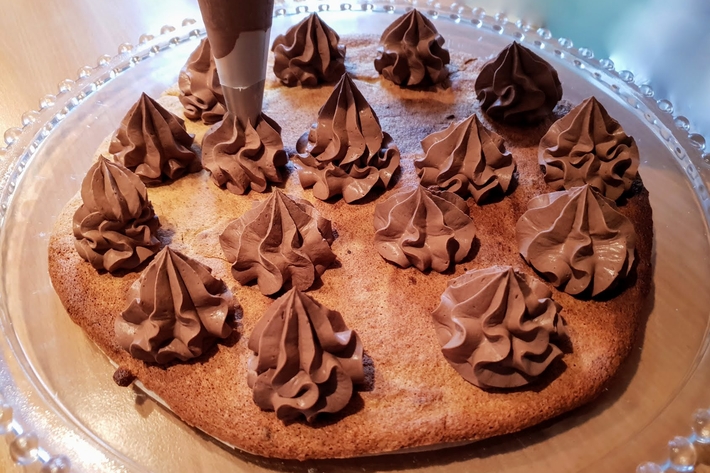 Disposez un premier disque de dacquoise sur le plan de travail et répartissez dessus des petits tourbillons de ganache montée.