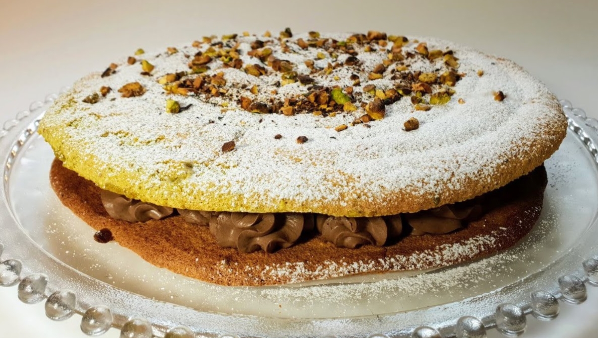 Saupoudrez du sucre glace à travers une passoire et décorez avec des pistaches hachées torréfiées.