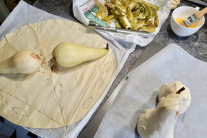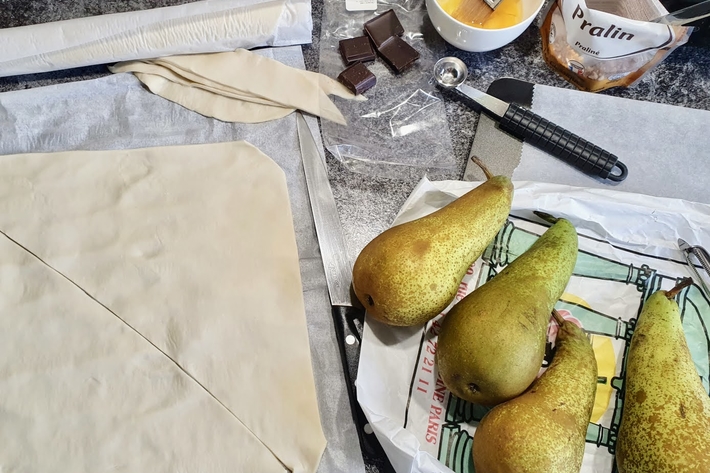 Coupez chacune en deux triangles : pour quatre poires, utilisez donc deux rouleaux de pâte, mais pour trois, un seul rouleau suffit, que vous coupez en trois tiers.