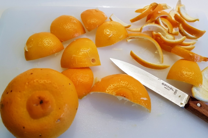 Découpez les écorces d’environ 4 oranges ou citrons en lanières ou en petits dés, selon l’usage que vous voulez en faire.