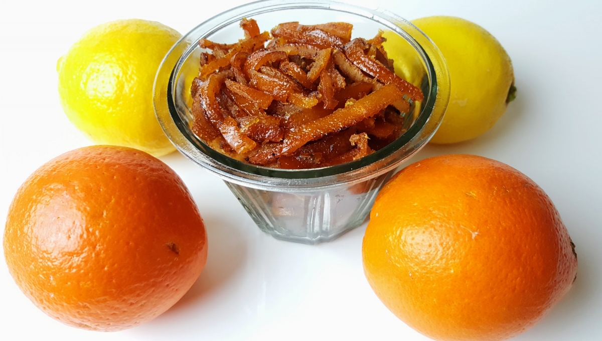 Ne jetez plus vos épluchures d’oranges et/ou de citrons non traités. Lavez-les, essuyez-les, coupez-les en lanières et gardez-les au congélateur jusqu’à ce que vous en ayez suffisamment pour les confire. Elles entrent dans de nombreux pains d’épices de Noël germaniques. Une fois confites, ces écorces se conservent plusieurs mois et attendront que vous lanciez dans la confection d’Elisen-Lebkuchen ou d’un Berawecka, sans que vous ayez à les acheter.