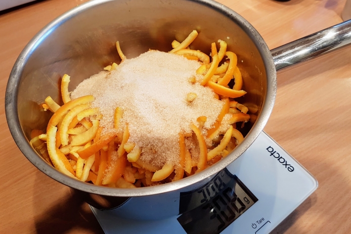 Pesez ces écorces ainsi blanchies et égouttées et ajoutez-leur la même quantité de sucre ou un peu moins : pour 300 grammes d’écorces, vous pouvez n’ajouter que 250 grammes de sucre.