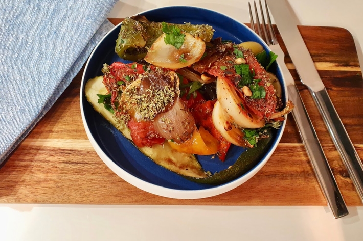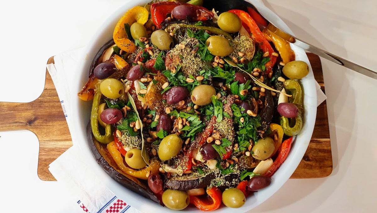 Sortez les légumes du four, laissez-les tiédir, ajoutez les olives, le persil ciselé et les pignons.