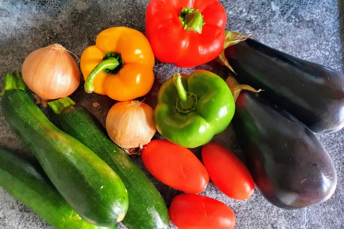 Épépinez les poivrons avant de les couper en larges lanières. Épluchez les oignons, coupez-les en grosses rondelles. Coupez les aubergines, les courgettes et les tomates en grosses lanières aussi.