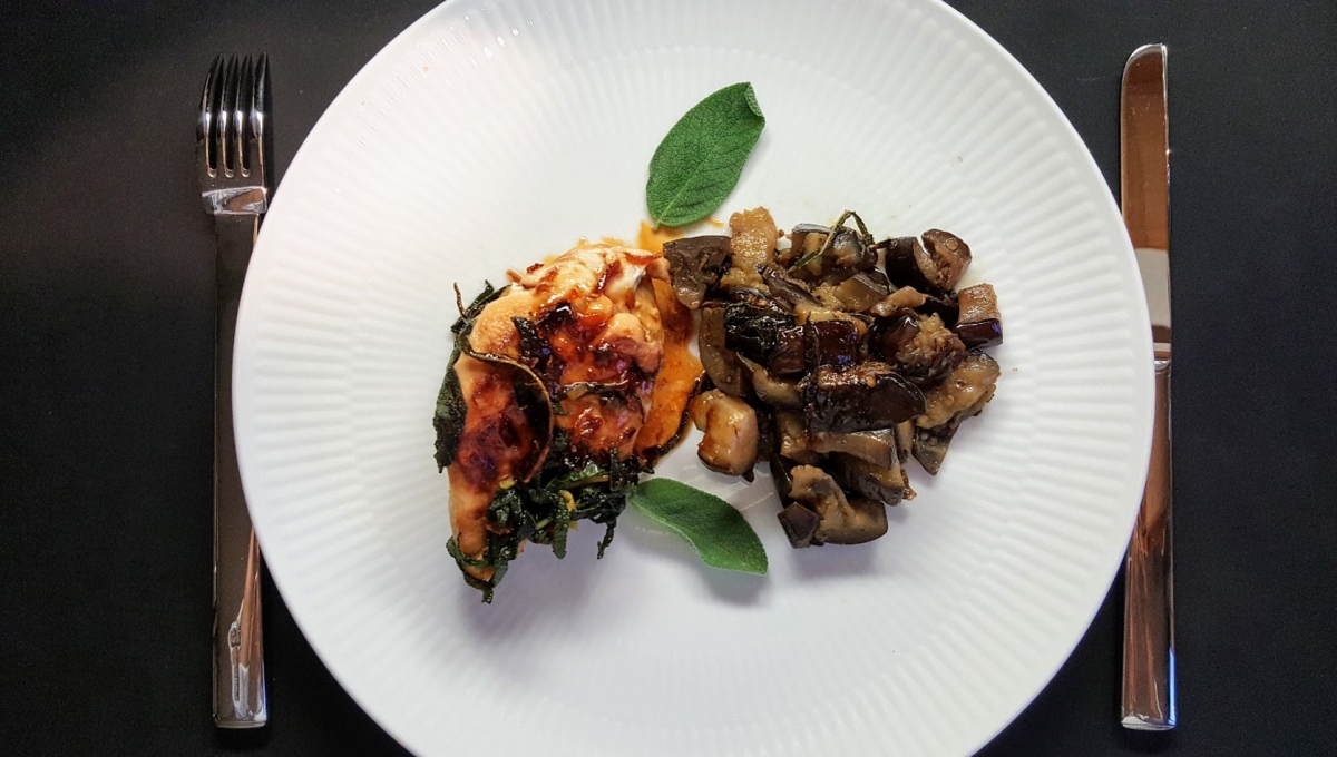 “Les aubergines trouvent leur juste valeur dans cette recette de poulet aux influences asiatiques. Le mélange miel et citron complété de la sauge parfume agréablement la chair de volaille qui reste moelleuse grâce à sa cuisson à l’eau bouillante.”