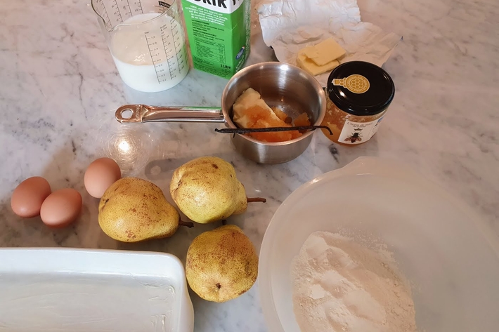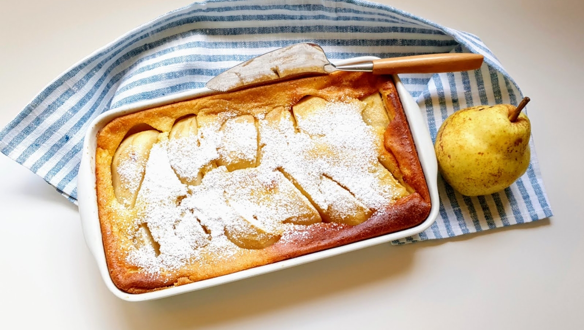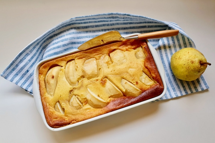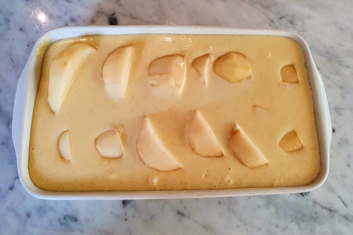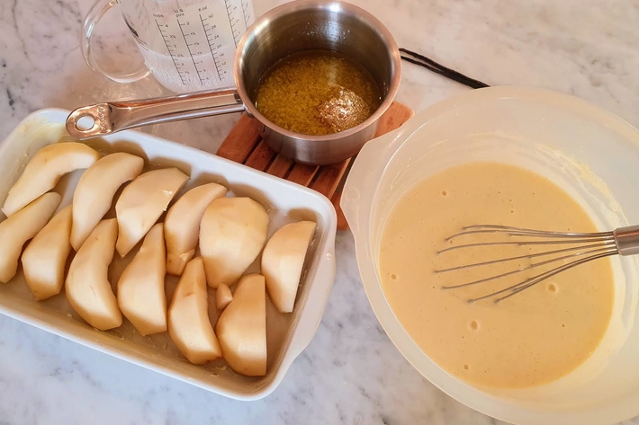 Versez cet appareil sur les poires, dans le plat à gratin.