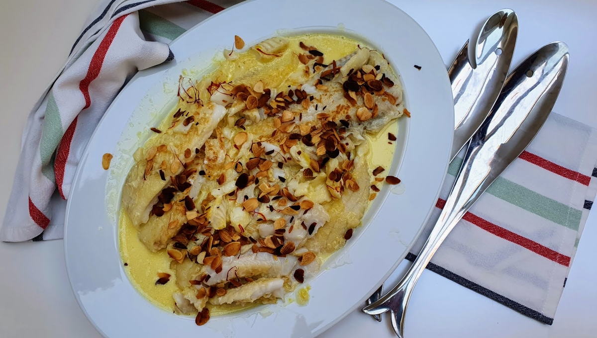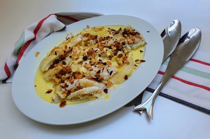 Rangez les filets de poisson aussi soigneusement que possible dans un grand plat (de préférence réchauffé dans le four tiède) et recouvrez avec les amandes grillées.