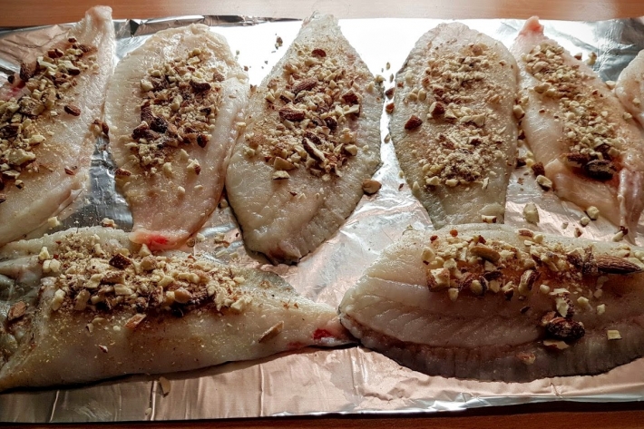 Recouvrez la face sans peau des filets avec des amandes pilées et appuyez bien dessus.