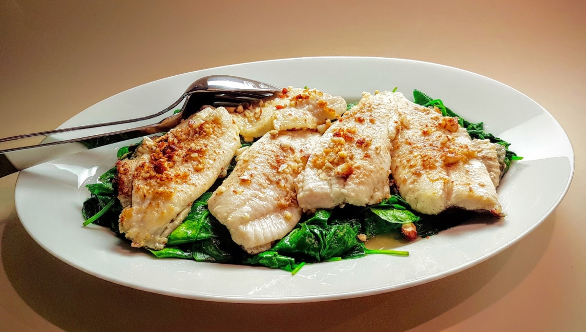 Déposez les épinards dans le plat, recouvrez-les avec le poisson, côté amandes sur le dessus, arrosez avec jus de cuisson et servez immédiatement.