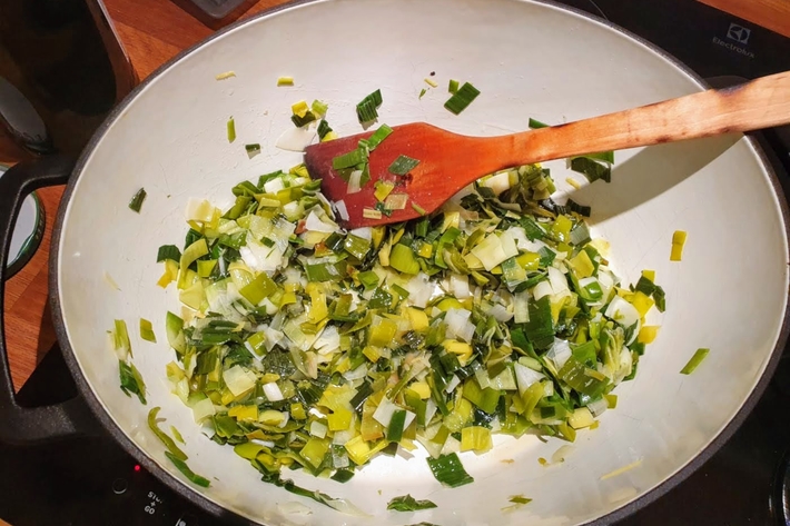 Faites chauffer les poireaux avec l’huile dans une cocotte et laissez-les fondre à feu moyen en remuant de temps en temps pendant un petit quart d’heure.