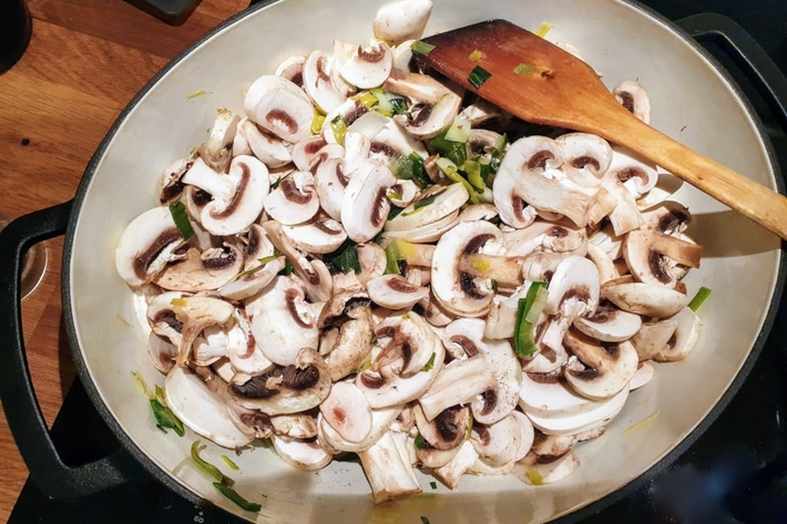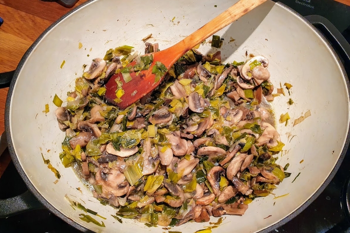 Ajoutez les champignons dans la cocotte (ajoutez un peu d’huile si les poireaux menacent d’attacher), salez et mélangez le tout.