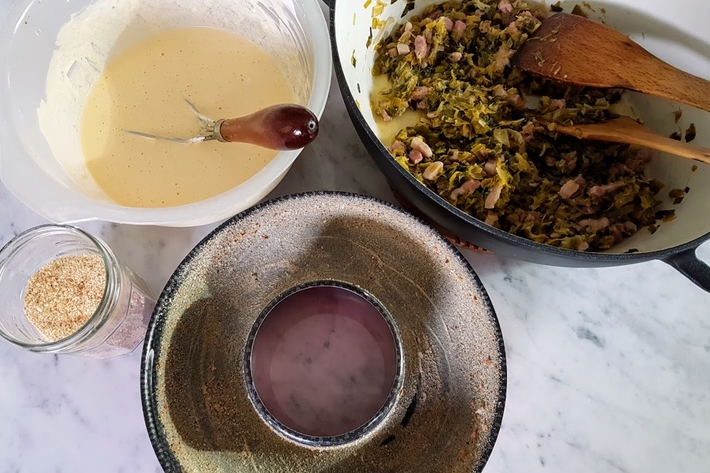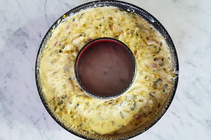 Mélangez les poireaux aux lardons avec la garniture aux œufs.