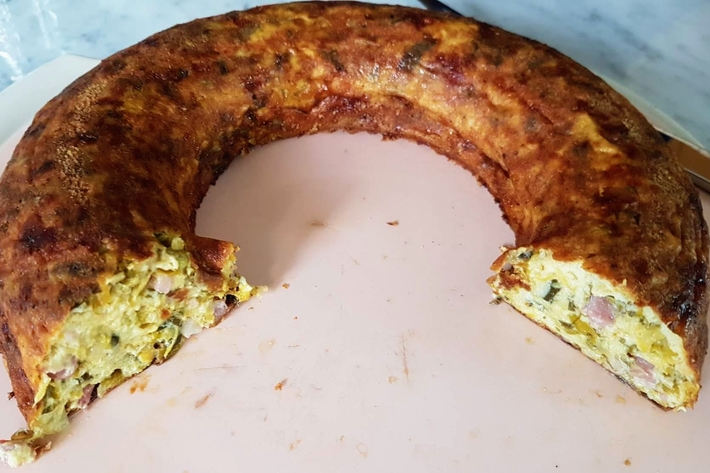 Fouettez ensemble les œufs avec la crème et le yaourt à la grecque et poivrez. Ajoutez un peu de muscade de quatre-épices.